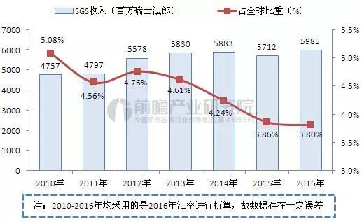 2016年,SGS營收達59.85億瑞士法郎(折約55億歐元、折人民幣約419億元),按固定匯率計算同比增長6.0%,是全球大的檢測機構,占比約為3.8%;調整后息稅前利潤為11.98億瑞士法郎,同比增長2.5%;調整后營業利潤達到9.19億瑞士法郎,實現2.4%同比增長;凈利潤為5.86億瑞士法郎,同比增長達到4.5%。
