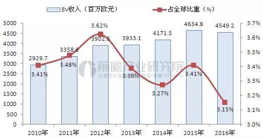 圖表1:2010-2016年BV經營情況及占全球比重(單位:百萬歐元,%)
