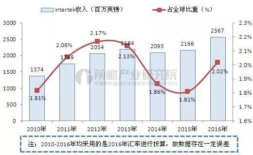 圖表1:2010-2016年Intertek經營情況及占全球比重(單位:百萬英鎊,%)