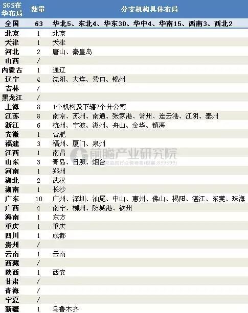 瑞士SGS集團自進入中國后,陸續在北京、上海、深圳、天津、大連、青島、廣州、廈門、深圳、寧波、秦皇島、南京、湛江和武漢等地注冊成立了分支機構。
