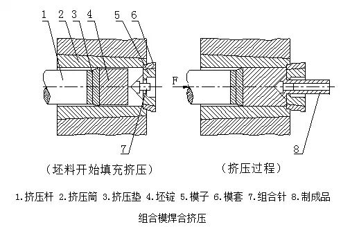b. 組合模焊合擠壓:擠壓時采用實心坯錠,組合針和模子是一個整體或裝成一個剛性結構。
