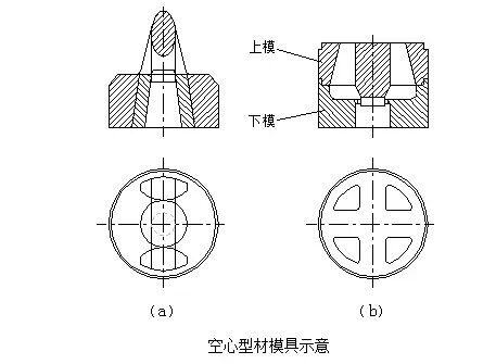 這種方法擠壓的空心型材沒有接逢,一般用于形狀簡單、內孔直徑較大的異形斷面管材,如下圖所示。