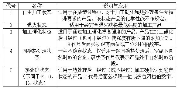 根據GB/T 16475-1996《變形鋁及鋁合金狀態代號》,鋁合金的狀態如下表: