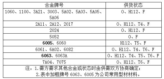 根據GB/T 6892-2000《工業用鋁及鋁合金熱擠壓型材》,常見鋁及鋁合金牌號、狀態如下表所示: