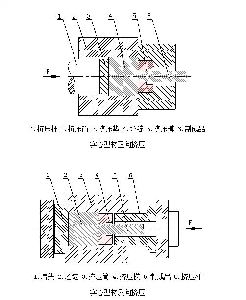 實心型材擠壓采用兩種基本方法,即金屬正向流動的擠壓、金屬反向流動的擠壓。