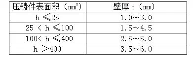根據壓鑄件的表面積大小劃分,鋅鋁合金壓鑄件的合理壁厚如下表所示: